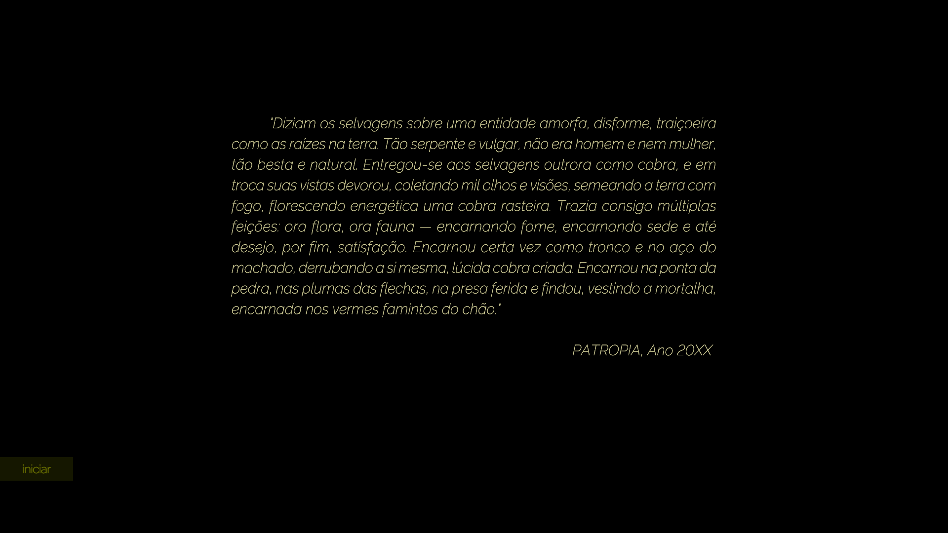O jogo tem um enredo imersivo de tiro em primeira pessoa, que propõe uma narrativa por ambientação, e tem como proposta imergir o jogador em uma trama alternativa da realidade brasileira - hiperbolizando elementos artísticos e abstratos, a fim de referenciar as respectivas situações políticas, econômicas, sociais e culturais do cotidiano nacional.